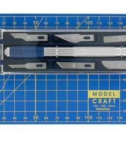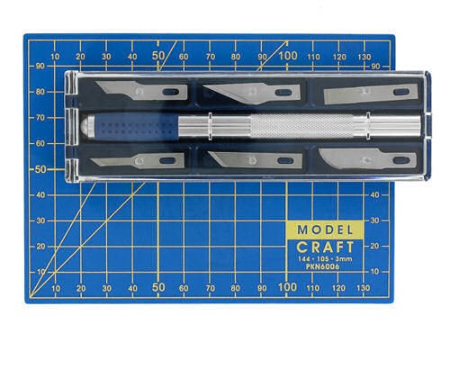Modelcraft 8 Piece Knife Set & A6 Cutting Mat. This is a complete set of knives/blades and tools for cutting precision work. The self-healing 3 layers PVC Mat in sandwich structure ensures no cracking or warping. Ideal for craft, hobby and DIY jobs