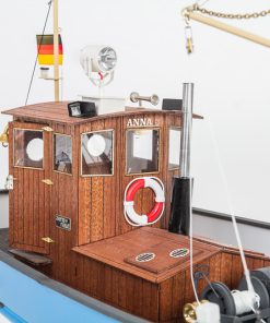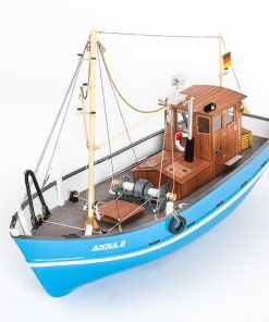 The Anna 3 Fishing Trawler kit contains: finished ABS hull, lasered boat deck, precisely lasered wooden parts made of mahogany plywood and birch plywood, aluminum tubes for masts and booms, rigging, stern tube with shaft and detailed assembly instructions. The fitting set is already with us for the model consists of functional headlights, position lights and lamps, anchors, blocks, net winch as a kit, cleats, net gallows, pulleys, lifebuoys, portholes and many small parts, as well as approx. 100 etched parts made of nickel silver.