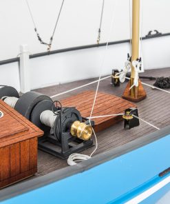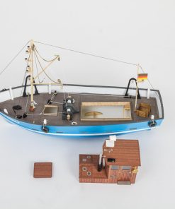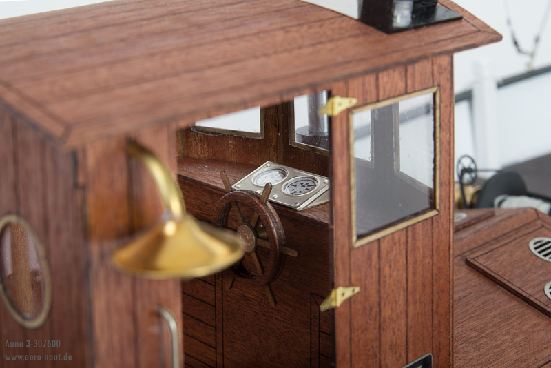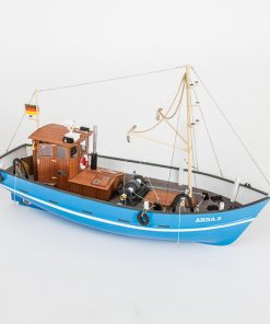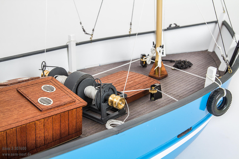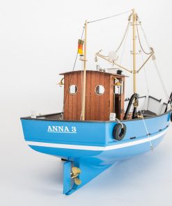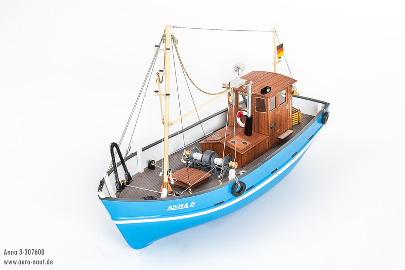Anna 3 is a replica of a Breton trawler that goes fishing with a trawl net attached to the side. The large, voluminous hull of the kit is deep-drawn from ABS. All of the wooden parts are laser-cut and made to fit perfectly in the usual aero-naut quality. The deck of the boat is already provided with planks and markings that are laser engraved and the cabin is made of fine mahogany plywood, the window panes are precisely cut from Vivak.