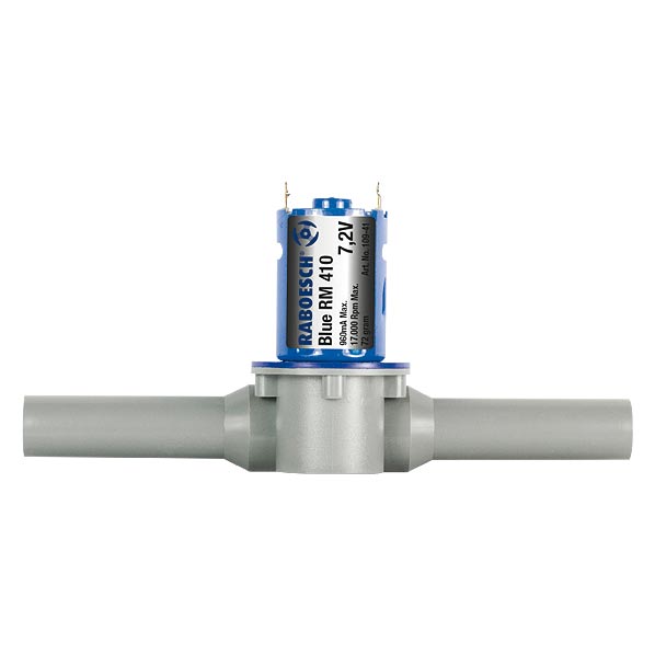 This very powerful bow thruster is supplied fully mounted with a Blue RM-410 7.2-Volt electrical motor, 11 Amp. max. The propulsion is provided by a flat impeller (paddle) which pressurizes the water through jet nozzles whereby the entire assembly functions as a pump. This design is very robust and very stable and requires very little maintenance. The pump housing and the extension tubes are made of ABS (acrylonitrile butadiene styrene). The motor is sealed with a G-ring and an O-ring which prevents the entry of water whereby the bow thruster can be installed vertically as well as horizontally. The motor with the pump housing cover can be removed easily. The cover has an O-ring that ensures water-tight sealing of the entire assembly. For further technical information: See the dimensional drawing and the technical details of the motor. Blue RM-410 electrical motor. Max. RPM 17.000 – voltage without load: 0.5 Amps Highest performance: 78% – Motor shaft: 2.3 x 12 mm.
