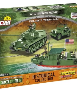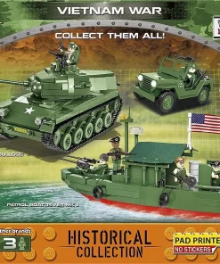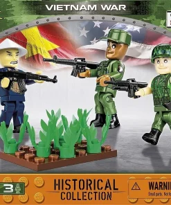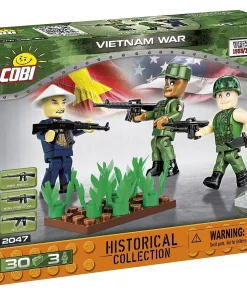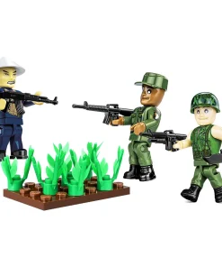 This new set of three figures from COBI depicts soldiers fighting during a conflict in the Indochina Peninsula. Each figure represents a member of a different unit. A Vietcong soldier features a pad-printed uniform and is equipped with a straw-hat characteristic for this region. It is armed with an AK-47 rifle. A soldier of the American 101st Airborne Division, in addition to the pad-printed uniform, received an eagle print on his shoulder—the emblem of this famous division. It is armed with an M16 automatic rifle. The last figurine shows a Marines soldier wearing a bulletproof vest. It is equipped with an American helmet with a printed realistic camouflage. He is also equipped with an M16 rifle with a grenade launcher.