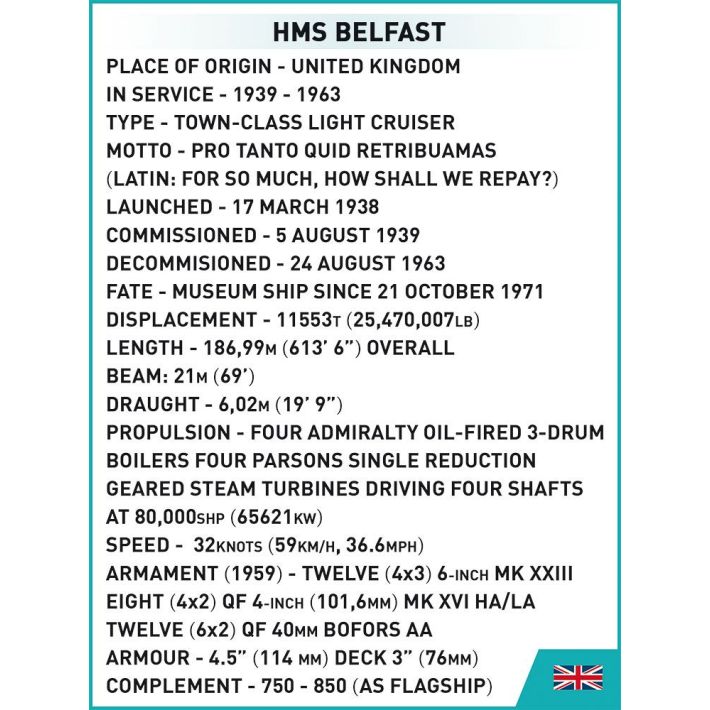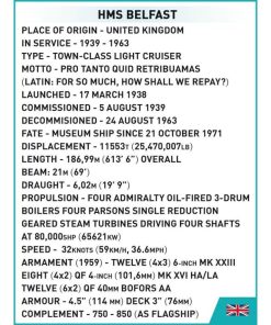 The COBI company, as part of a prestigious cooperation with the IMW (Imperial War Museums), has prepared a model of the historic British cruiser HMS Belfast. The ship was designed on a scale of 1:300 and faithfully reflects the details of its historical inspiration. The light cruiser is 64 cm / 25.2″ long and 19.5 cm / 7.7″ high. It has many movable elements, such as deck guns, rotating artillery towers, rudders and propellers. The model has been covered with high-quality prints representing equipment and camouflage. Prints do not rub off even during intensive use. The set includes a black display stand and a white plate with the name and scale of the model printed on it. The plaque also features the IMW (Imperial War Museums) logo. The Belfast will make a perfect gift for all lovers of history, military and marine science. It will also look great on a desk, bookshelf or on a shelf with souvenirs. Build history, piece by piece, with COBI.