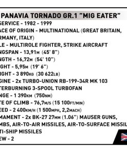 Using 527 high-quality COBI construction blocks you can build the famous British multi-role Panavia Tornado fighter with all of its extraordinary history! The given name “MIG EATER” (Polish: Migoeater Eater) refers to the famous story of the destruction of an Iraqi aircraft during the initial period of the First Persian Gulf War in 1990. The set also includes two unique figures of British pilots captured by the Iraqis during the same conflict. After their release, the pilots were photographed with the “Mig Eater” plane. Our set brings together these two very different and extraordinary military stories.