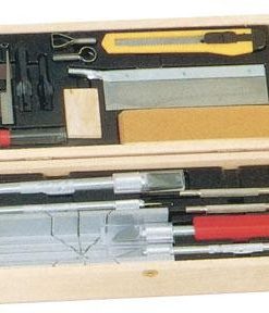 Set Contains: 1 – K1 Knife, K2 Knife, K5 Knife, K10 Knife, 1 Mitre Box, 2 Screwdrivers, 1 Sanding Block, 1 Razor Saw, 4 Assorted Gouges, 2 Assorted Routers, 1 Whittling Blade, 1 Needle Point Awl, 6 Additional Blades