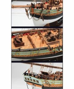 Corel’s wooden model kit features a plank-on-bulkhead construction with double planking. This gives the hull a strength, and allows for nicely shaped hull and planking finish. The kit includes all major structural parts from pre-cut wood. A parts tray holds all the wood, brass, and cast metal fittings. The kit also includes silk screened flags, sail cloth material, rigging line, and 10-sheets of plans for clear construction. Also includes a wooden display base.