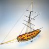The model ship includes a set of pieces of board cut by laser of high precision, noble woods, brass, cast iron and cotton sails cut and sewn by hand ready to be place. For the assembly you will be able to follow our complete step by step guide in 7 languages and in full color, accompanied by the real-scale drawings of the finished model. Once the model is finished, it is 12” (305 mm) length, 13.98” (335 mm) height and 3.93” (100 mm) width.