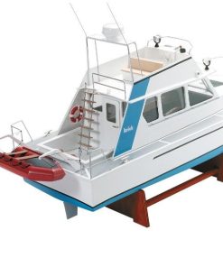 The deck is made of one piece of plywood and has a large opening for easy access to the interior. The complete assembly can be removed in one piece. All hardware parts, made of plastic or metal, are part of the kit. The dinghy is available as an additional kit. But even without a dinghy at the rear, this model looks great. The drive is a powerful 480 class motor with interference suppression capacitors, cables and articulated coupling.