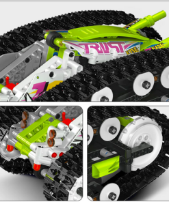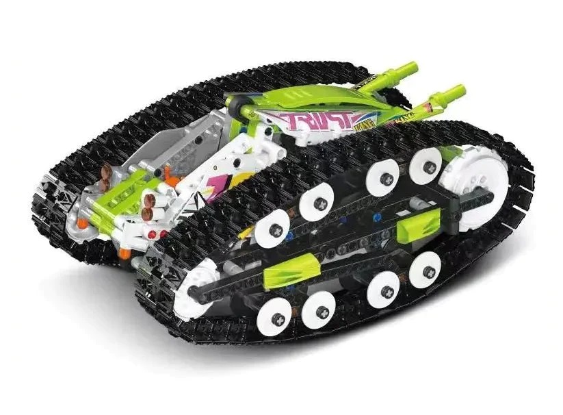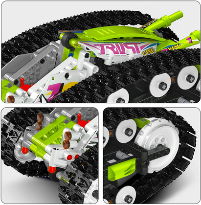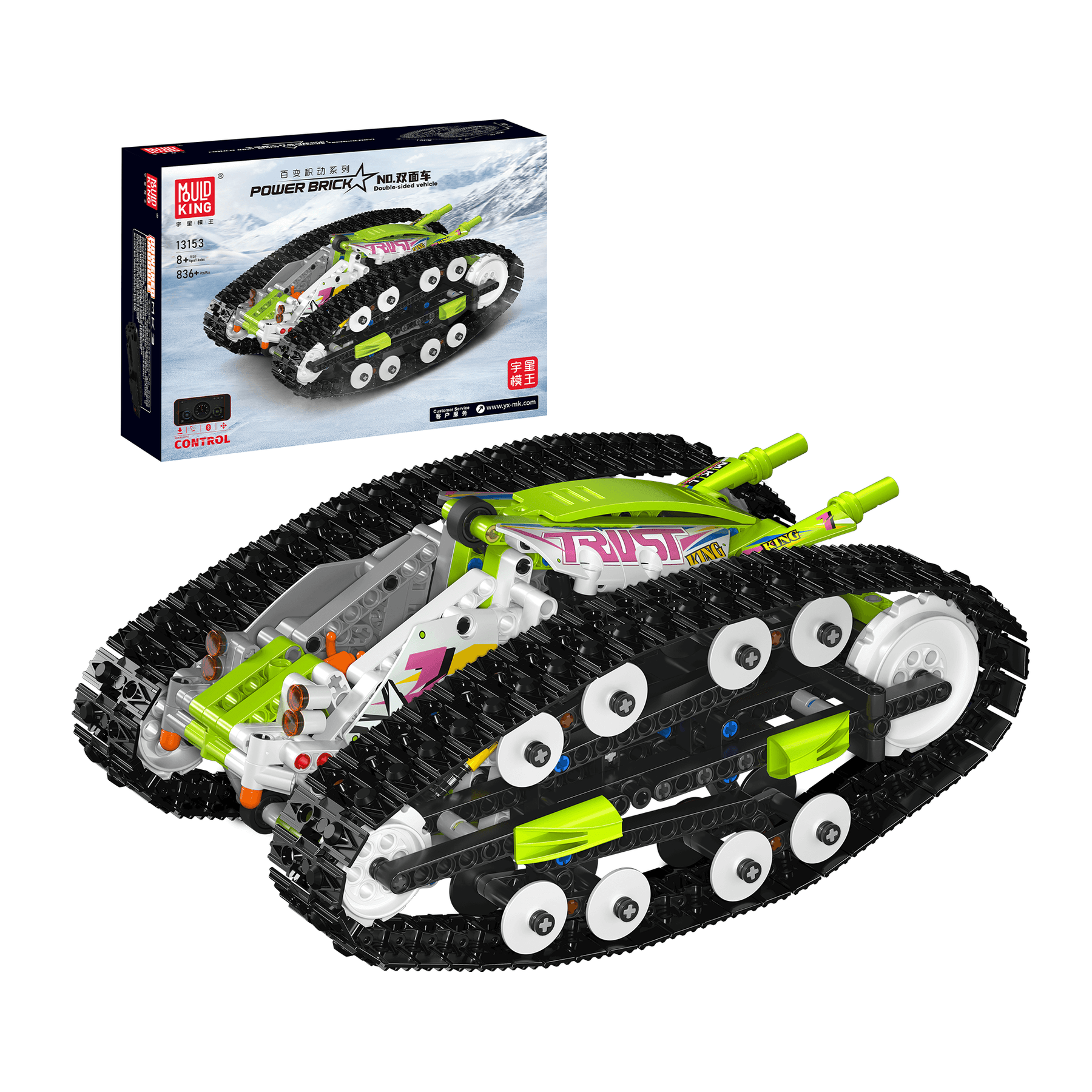 Assembled from 836+ parts, the vehicle features suspension and tracks, the suspension allows the tracks to adapt to uneven surfaces.