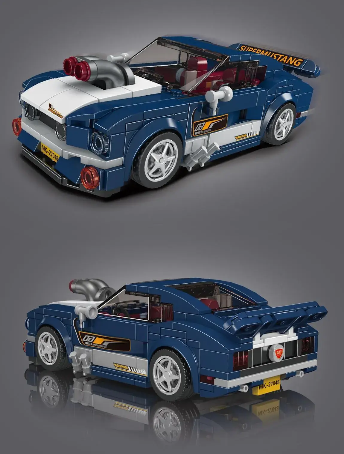 Distinct features like the ‘SuperMustang’ decal on the roof, racing number ’87’ on its side, and striking twin exhausts echo the powerhouse that the original Mustang was known for. The intricate detailing, from its unique headlights to the red interior and ‘MK-27048’ license plate, showcases the dedication to capturing every nuance of the original vehicle.