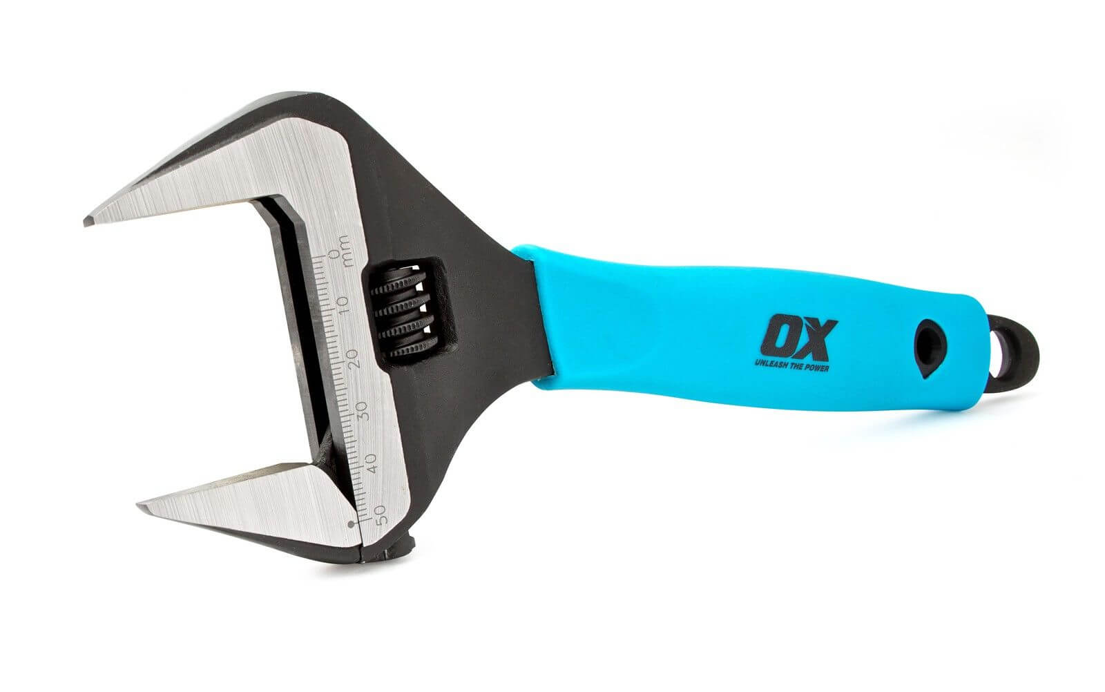 OX Tools Pro Adjustable Wrench has an ultra-wide jaw opening of 34mm and a slim head design for ease of access in tight spaces.