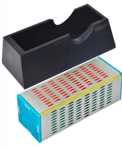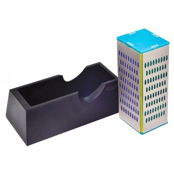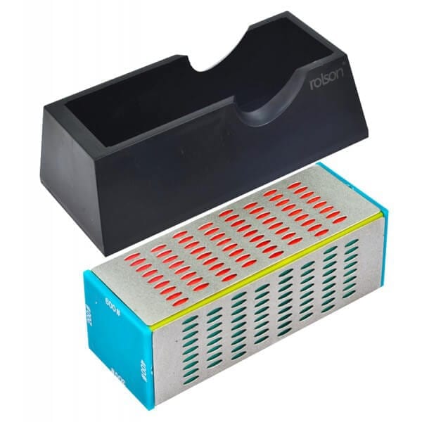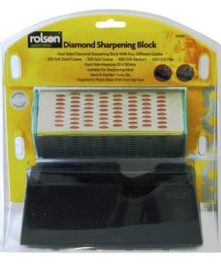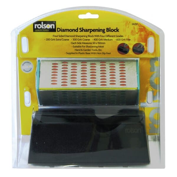 Diamond Sharpening Block Four sided diamond sharpening block with four different grades. 200gr: Extra Coarse, 300gr: Coarse, 400gr: Medium, 600gr: Fine. Each side measures 50 x 150mm, suitable for sharpening most hand and garden tools etc. Supplied in plastic base with non slip feet