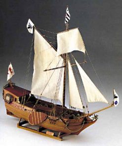 Corel’s Yacht D’Oro kit uses pre-cut frames and keel for its single plank-on-frame construction. Wooden formers assure proper hull shape, and pre-formed resin transom saves building time. Correctly scaled blocks, deadeyes and belaying pins, burnished metal cannon on wooden carriages and brass ornamentation outfit your model. A photo-etched copper sheet reproduces the elaborate detailing of the bulwarks, doors, windows and other trim. Three diameters of rigging line, cotton sail cloth and silk-screened flags complete the kit. Plans are on two large sheets.
