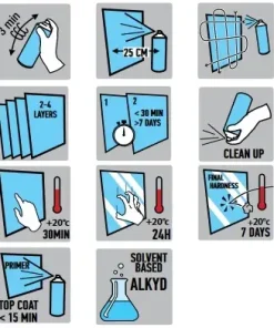In addition – Surface preparation: For best results, ensure surface is clean, dry & free from loose paint, mould & mildew, wax or oil. If wax has been used, clean the surface thoroughly with white spirit. We recommend that bare wood should be sanded before painting. Hard glossy surfaces should be abraded before painting. Cover surrounding areas to protect from spray mist.